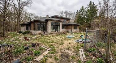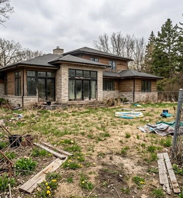Before and after photo of a Minnesota yard transformed with lush green lawn and colorful flower beds.