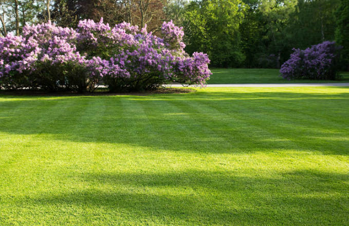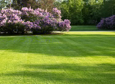 A vibrant green lawn freshly mowed with neat edges under a clear blue sky.