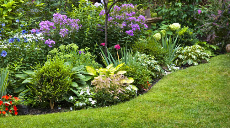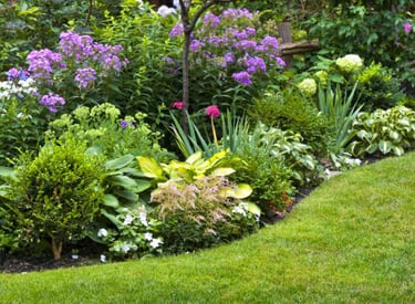 A beautifully designed garden bed with fresh mulch and colorful flowers.
